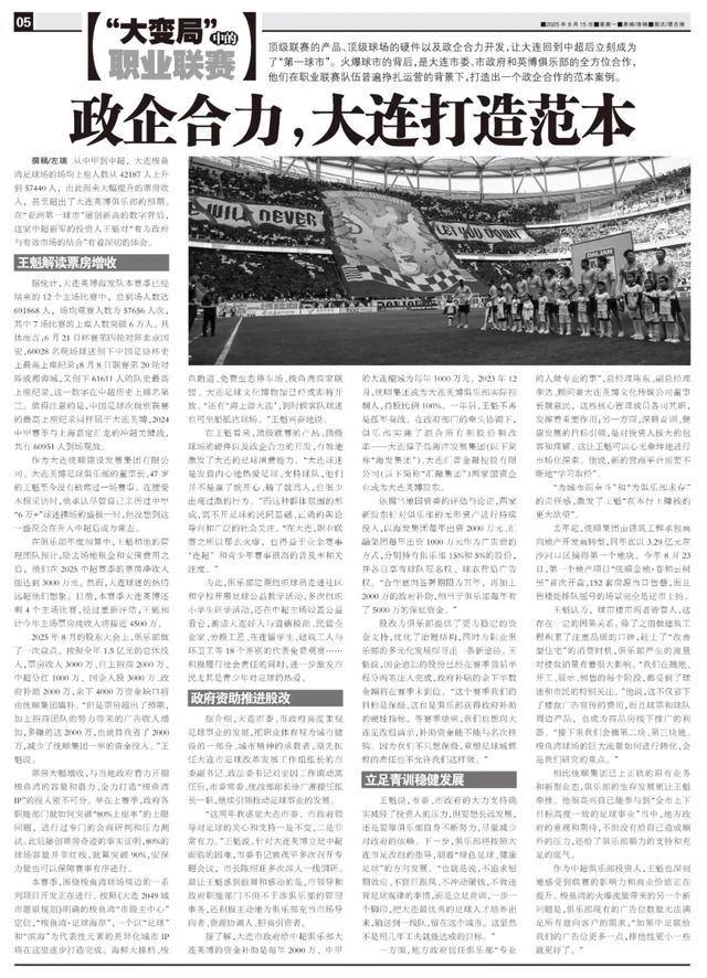 在王魁看来,顶级联赛的产品、顶级球场的硬件以及政企合力的开发,有效地激发了大连的足球消费能力。“大连球迷是发自内心地热爱足球、支持球队,他们并不是赢了就开心、输了就骂人,也很少出现过激的行为。”而这种群体氛围的形成,离不开足球的民间基础、正确的舆论导向和广泛的社会关注。“在大连,职业联赛之所以那么火爆,也得益于业余赛事‘连超’和青少年赛事很高的普及率和关注度。”